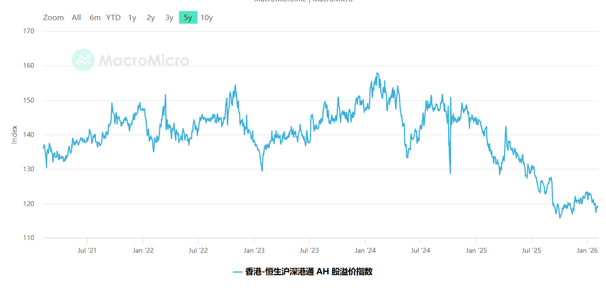 与此同时,AH股的整体价差也正在收窄。恒生沪深港通AH股溢价指数从2024年2月161.36点的近十年高位,一路下行至2026年2月6日的119.44点,基本回到了2019年约120点的水平。